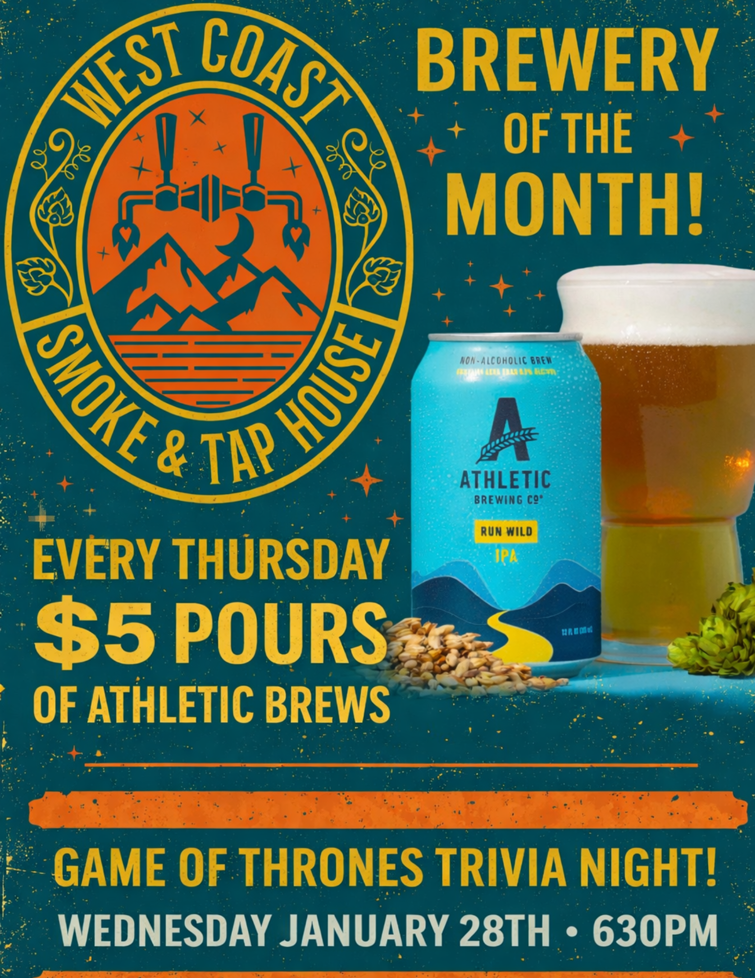 Welcome to West Coast Smoke and Tap House – your neighborhood pub serving great food. We have a rotating draft beer selection featuring some of the finest brews around. Check out the tap list link above for our current list. In addition to the menu items you will find on our website, please check out our daily specials food board as you walk into West Coast. We have friendly new staff and new food items, including soups, sandwiches, and salads. We are open for lunch, at 11:00 am, seven days a week. Sunday Brunch is from 10am - 1pm.