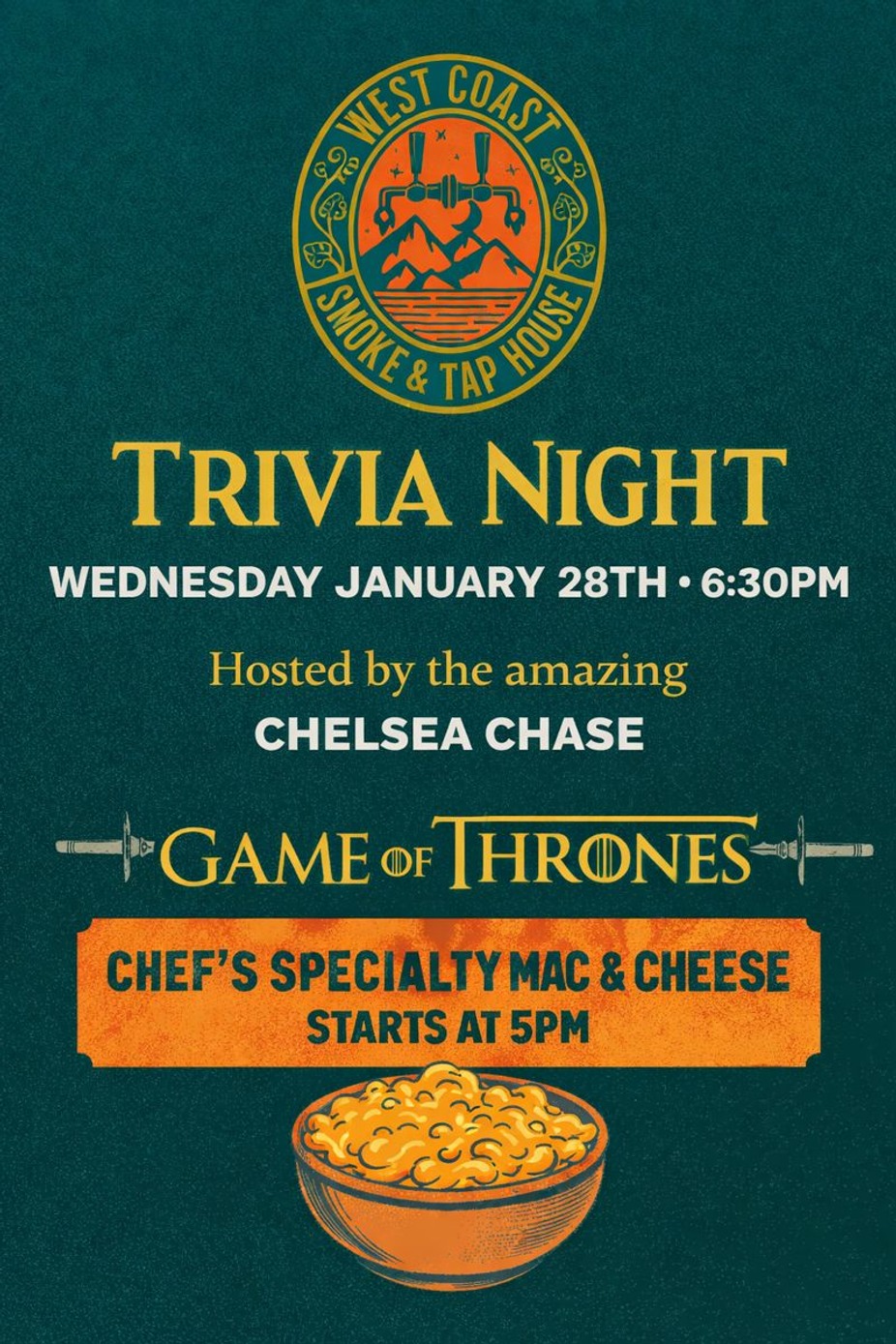 Get ready for a night of trivia, brews, and comfort food at West Coast Smoke and Tap House! Join us for Trivia Night on Wednesday, January 28th at 6:30pm, featuring a fan-favorite theme: